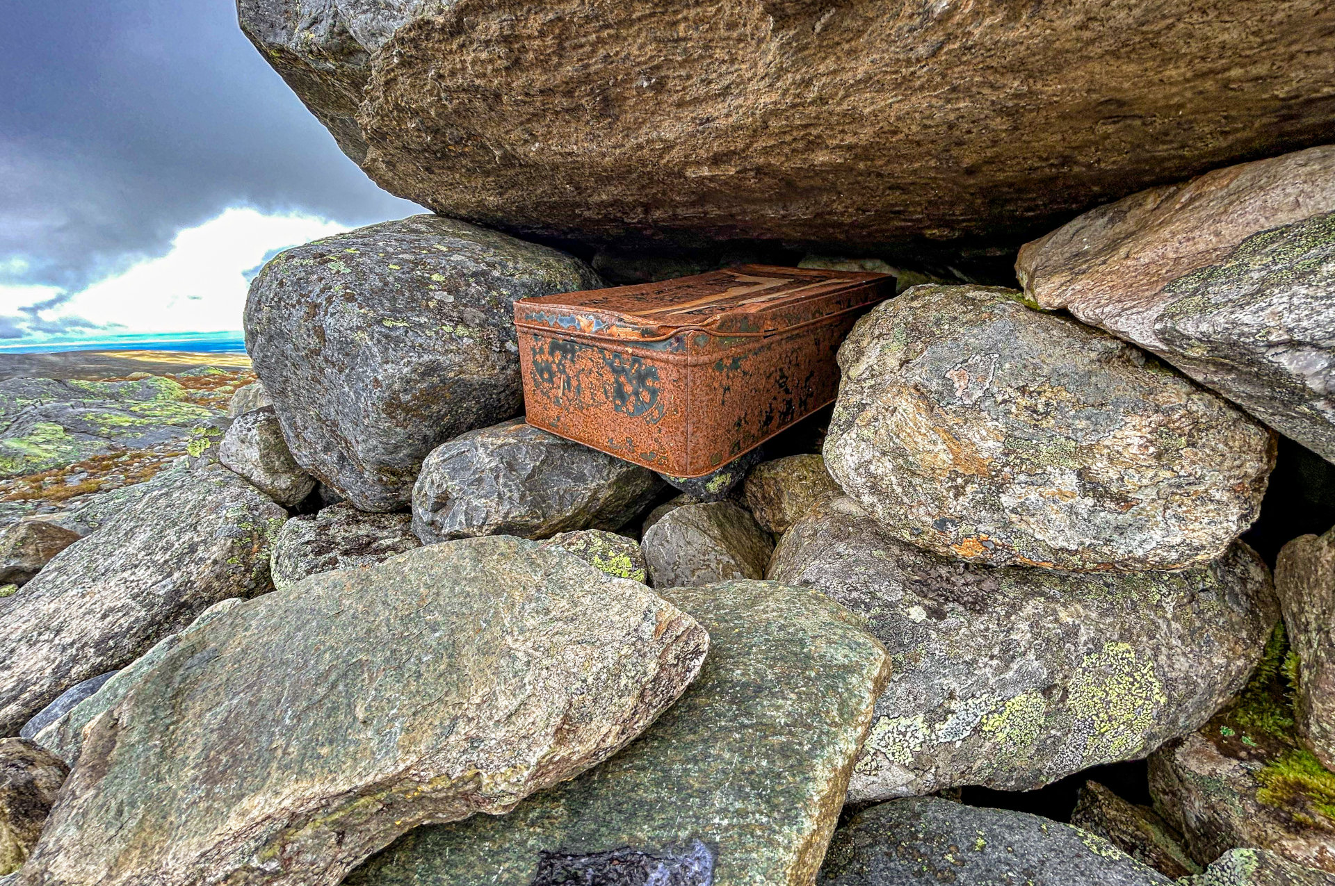 Das Gästebuch am Hundshögen ist etwas versteckt in der Gipfelpyramide. Aber nicht verwechseln mit dem Gästebuch des Geocaches dort.