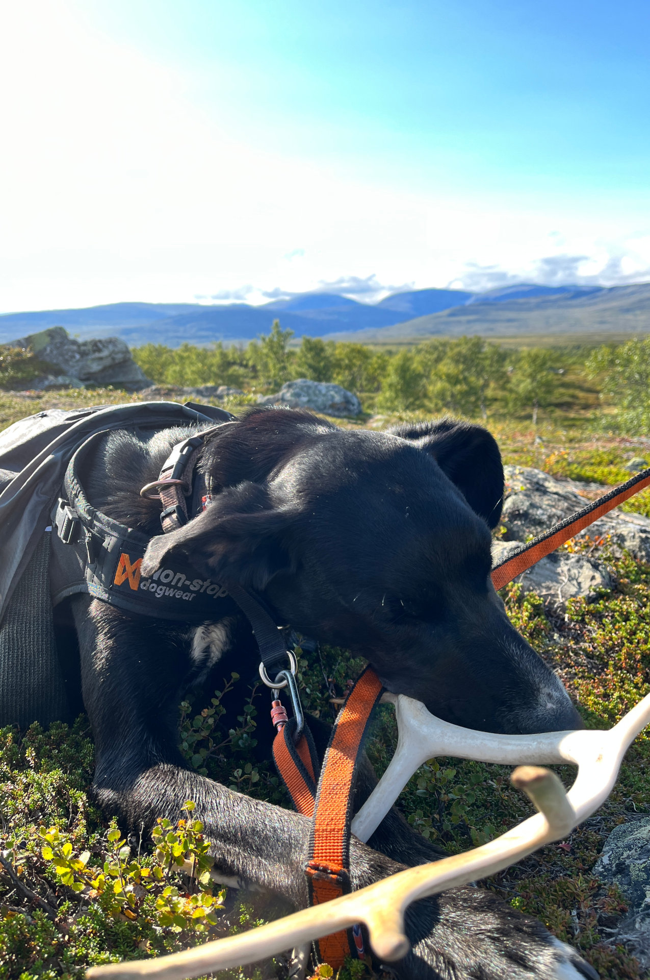 Der Hund ist beim wandern glücklich mit seinem gefundenen Rentiergeweih